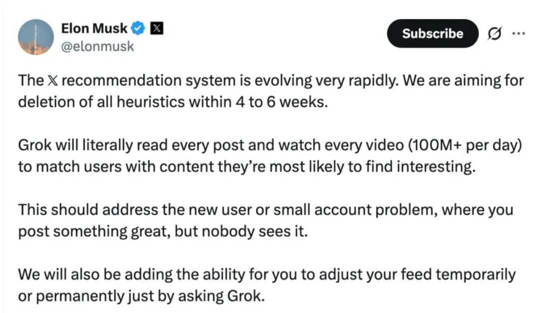 当时老马表示,要在未来几周内彻底移除X启发式推荐算法,由Grok接手,通过阅读和观看全部内容来全自动匹配用户兴趣。