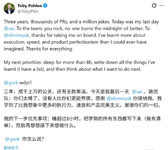 Toby Pohlen(2026年2月27日):最新一位宣布离职的联合创始人。他在公司2月重组后曾短暂领导数字智能体项目Macrohard。