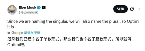 在回应网友提问时,马斯克明确表示:这款由特斯拉自主研发的机器人,单数形式为“Optimus”,而复数形式确定为“Optimi”。
