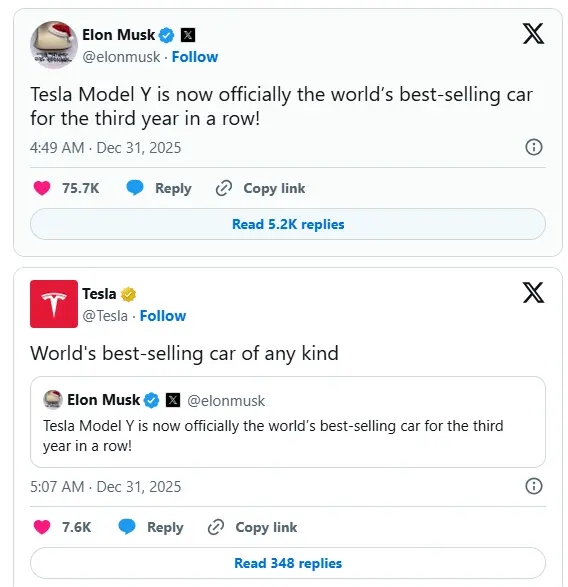 12月31日,马斯克在X上发文:“特斯拉Model Y现已正式连续第三年成为全球最畅销汽车!”随后,特斯拉官方账号转发了该条内容,并附文强调其“全球最畅销车型”的地位。