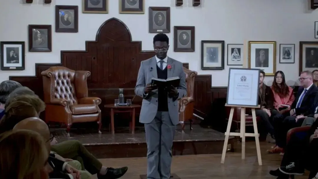 我当时在……是圣詹姆斯酒店吗?对,就是那里。那是个非常漂亮的地方,壁炉燃着熊熊炉火,我坐在一张我猜大概有三百年历史的椅子上。感觉太不可思议了。这就是我写下的文字。所以,露西、罗伯特、霍金家族的各位成员,以及在座的每一位杰出人士,我非常荣幸能获得斯蒂芬·霍金纪念奖。