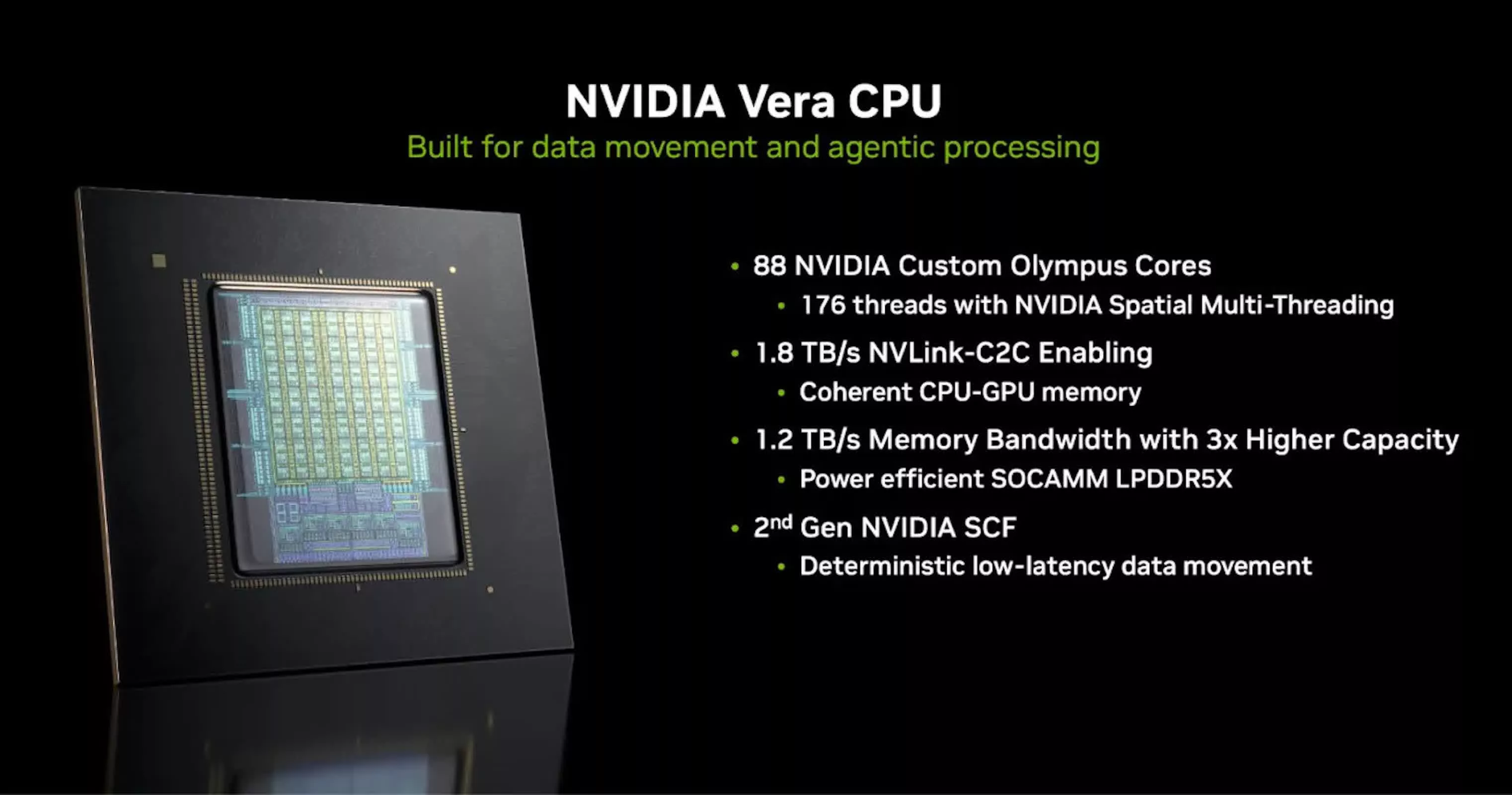 Vera 的核心架构一大亮点在于第二代可扩展一致性互联架构(Scalable Coherency Fabric),这是一条贯穿单芯片上 88 个核心的高速互联通路。该互联系统提供 3.4 TB/s 的对分带宽,使各核心间的数据交换高效且延迟更低,有意规避部分多芯粒(chiplet)设计中常见的同步开销问题,例如 AMD EPYC 这类产品所面临的跨芯粒协调挑战。同时,这一互联结构还与英伟达第二代 NVLink Chip-to-Chip 技术直接相连,最多可向包括即将到来的 Rubin GPU 在内的外部组件提供 1.8 TB/s 的一致性带宽。借助这一设计,Vera 与 Rubin 能够共享内存模型与数据,在同一计算框架内构建起统一的 CPU-GPU 计算环境。