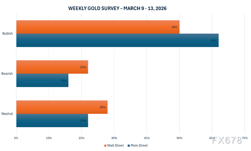 本周Kitco新闻黄金调查显示,华尔街意见严重分裂:18位分析师中,9位(50%)预计未来一周金价上涨,4位看跌,其余持中性。主街投资者情绪则回暖至2月初水平,62%的零售交易者看好未来一周进一步上涨。