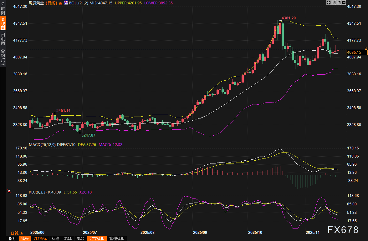 汇通财经APP讯——周四(11月20日)亚市早盘,现货黄金震荡微涨,目前交投于4088美元/盎司附近。周三金价冲高回落,早盘一度狂飙1.6%,最高摸至4132.66美元/盎司,可随着美元指数延续涨势,市场像被泼了一盆冷水,金价快速回落,美联储会议纪要偏向鹰派,美元指数刷新近两周高点,继续打压黄金多头士气,金价最终仅收涨0.25%,报4077.79美元/盎司。本交易日市场目光将转向美国9月份非农就业报告。