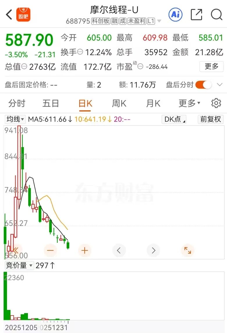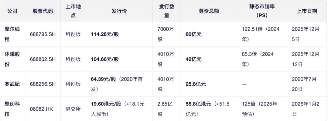 2 、壁仞科技在港股的发行价只有 19.6 港币,摩尔线程的发行价为 114.28,沐曦股份的发行价为 104.66,寒武纪的发行价为 64.39 亿。上市首日,沐曦股份涨了692.95%,摩尔线程涨了+425.46%,寒武纪涨了+229.24%,而港股壁仞科技连 100%都勉强。