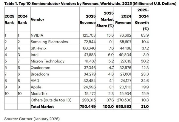 在Gartner发布的2025年全球半导体市场报告中,去年总营收达到7930亿美元,同比大涨21%,推动增长的主要引擎就是AI相关的半导体,包括AI处理器、HBM内存及网络互联芯片等,占了1/3的营收。