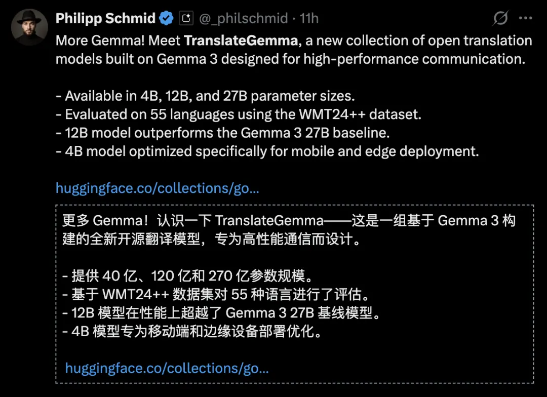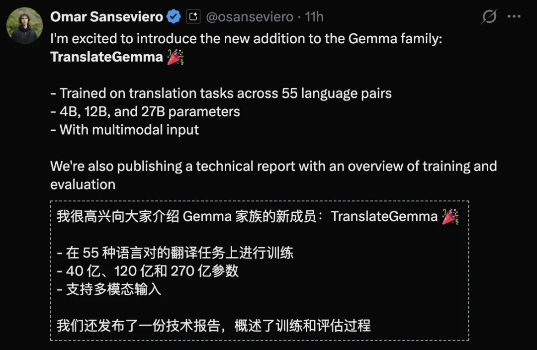 基于Gemma 3,Google发布了开源翻译模型TranslateGemma,它非常酷: