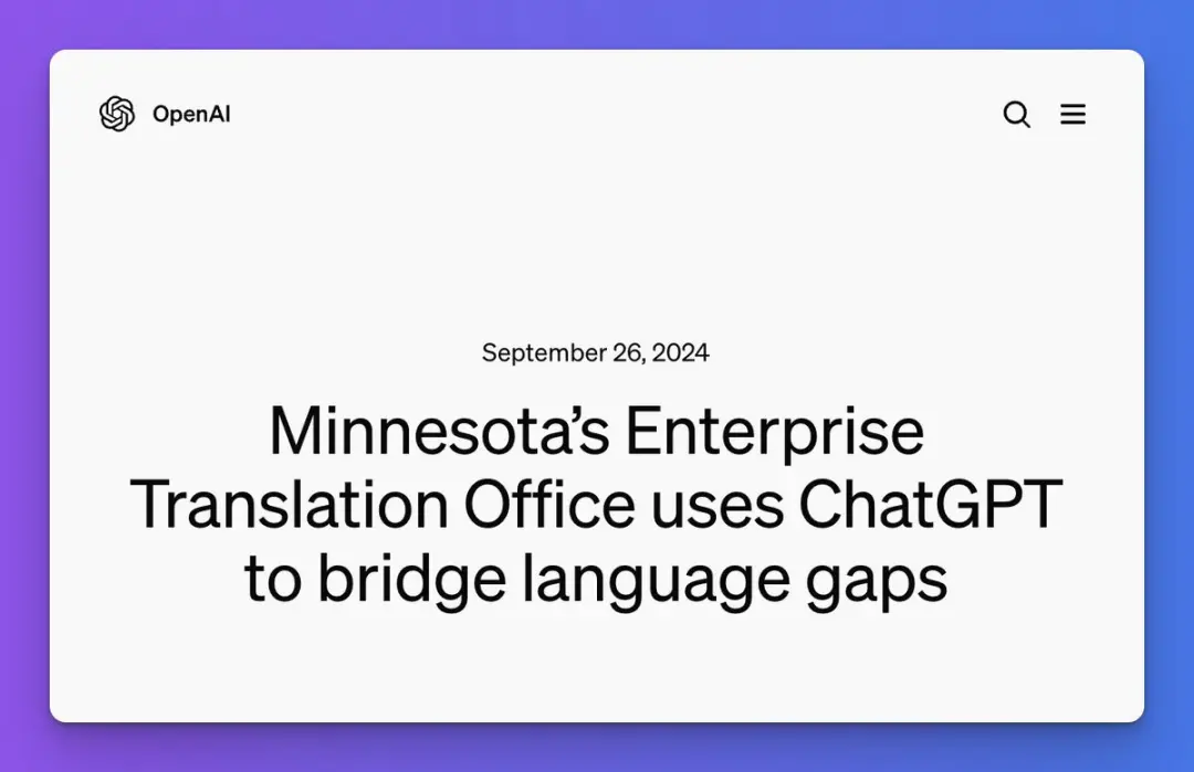 2024年,美国明尼苏达州政府利用ChatGPT加快并扩大面向非英语居民的翻译服务