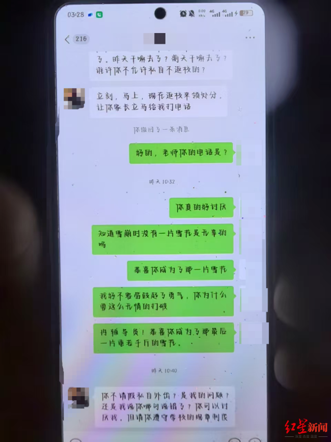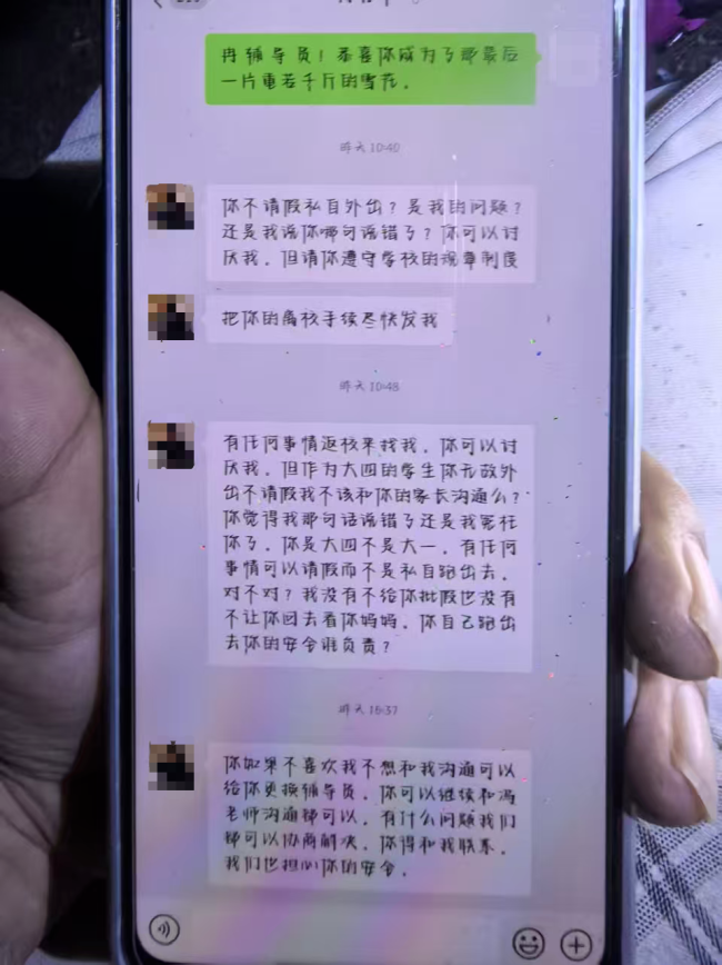 在没有得到回复后,冉某某又在微信中留言:“有任何事情返校来找我,你可以讨厌我,但作为大四的学生你无故外出不请假我不该和你的家长沟通么?你觉得我那(哪)句话说错了还是我冤枉你了。你是大四不是大一。有任何事情可以请假而不是私自跑出去。对不对?我没有不给你批假也没有不让你回去看你妈妈,你自己跑出去你的安全谁负责?你加果不喜欢我,不想和我沟通,可以给你更换辅导员。你可以继续和冯老师沟通都可以。有什么问题我们都可以协商解决。你得和我联系。我们也担心你的安全。”
