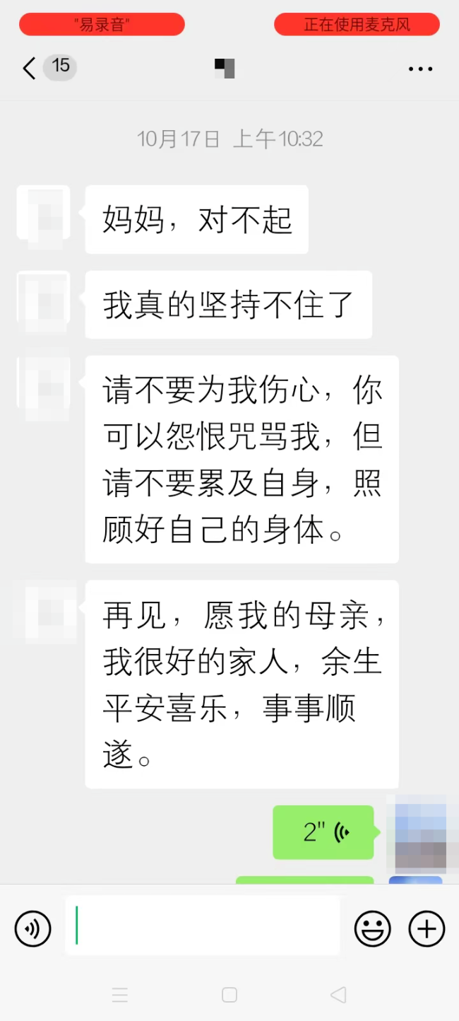 同时,陈某某给母亲也发送了最后的留言“妈妈,对不起,我真的坚持不住了,请不要为我伤心,你可以怨恨咒骂我,但请不要累及自身,照顾好自己的身体。再见,愿我的母亲我很好的家人,余生平安喜乐,事事顺遂。”