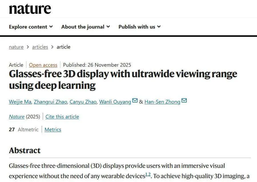 有史以来第一次,科学界可以在桌面级显示器尺寸上以超过100度的视角提供高质量裸眼3D,观看者无需佩戴任何设备。这不仅预示着数字世界将要迎来一场革命性的视觉升级,同时也进一步向世界证明:AI完全有能力在更多前沿科学领域“重写”物理边界。