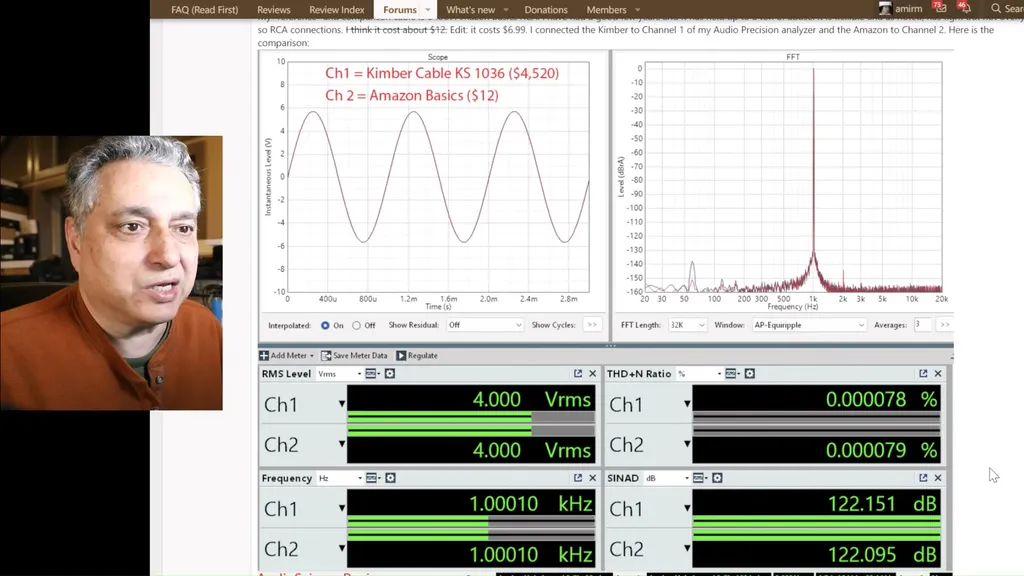 测试环节使用Audio Precision专业音频分析仪,在4kHz正弦波传输测试中,两条线均出现极微小失真,Kimber线甚至检测到略多的市电噪声干扰,但Amir表示"实际使用中两者完全相同"。
