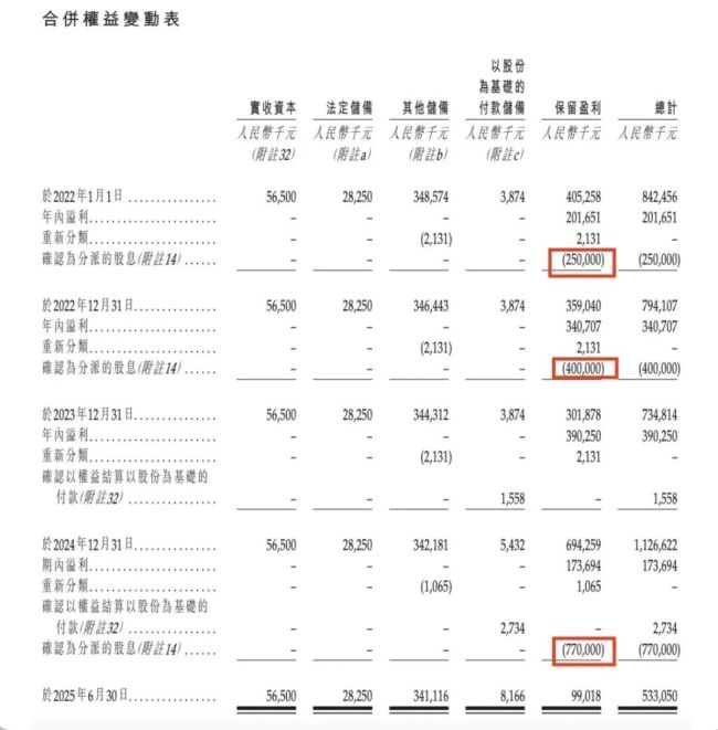 蔓迪国际在上市前夕,公司进行了“清仓式分红”。2022年至2025年上半年,公司共宣派股息14.2亿元