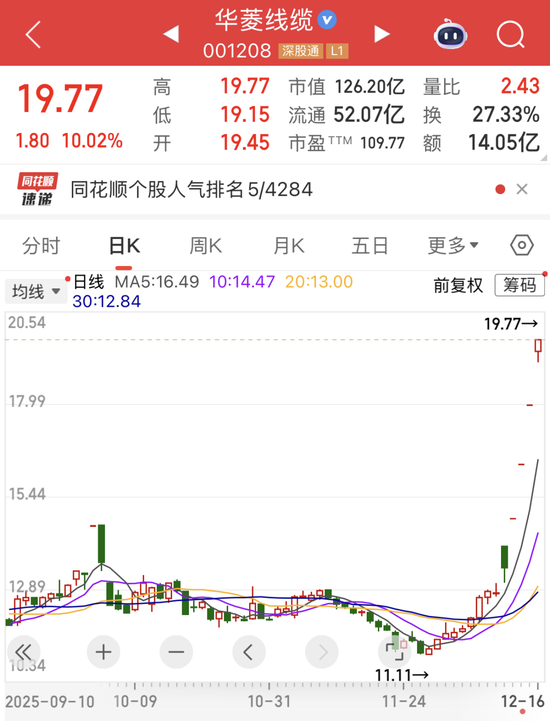华菱线缆在公告发布前已连续收获4个涨停板,12月16日收盘仍有14.49万手买单封板,封单资金达到2.86亿元。华菱线缆盘后龙虎榜数据显示,12月15日~16日,深股通专用席位净买入达2745.99万元,国联民生证券宁波分公司净买入达2.71亿元。