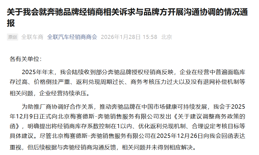 鉴于问题具有系统性且前期沟通未取得实质性进展,我会于2026年1月6日、1月23日两次分别向梅赛德斯-奔驰全球管理团队发送了《关于商请梅赛德斯奔驰全球总部关注中国市场经销商相关诉求的函》《关于再次呼吁梅赛德斯奔驰全球总部关注中国市场经销商相关诉求并采取紧急行动的函》,请其高度关注中国市场渠道风险,协同推动结构性改善。