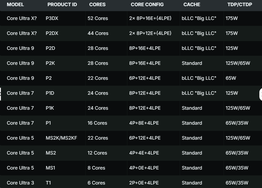 目前已知至少13款型号,覆盖35W到175W,产品线分为酷睿Ultra 9、Ultra 7、Ultra 5和Ultra 3四个等级。