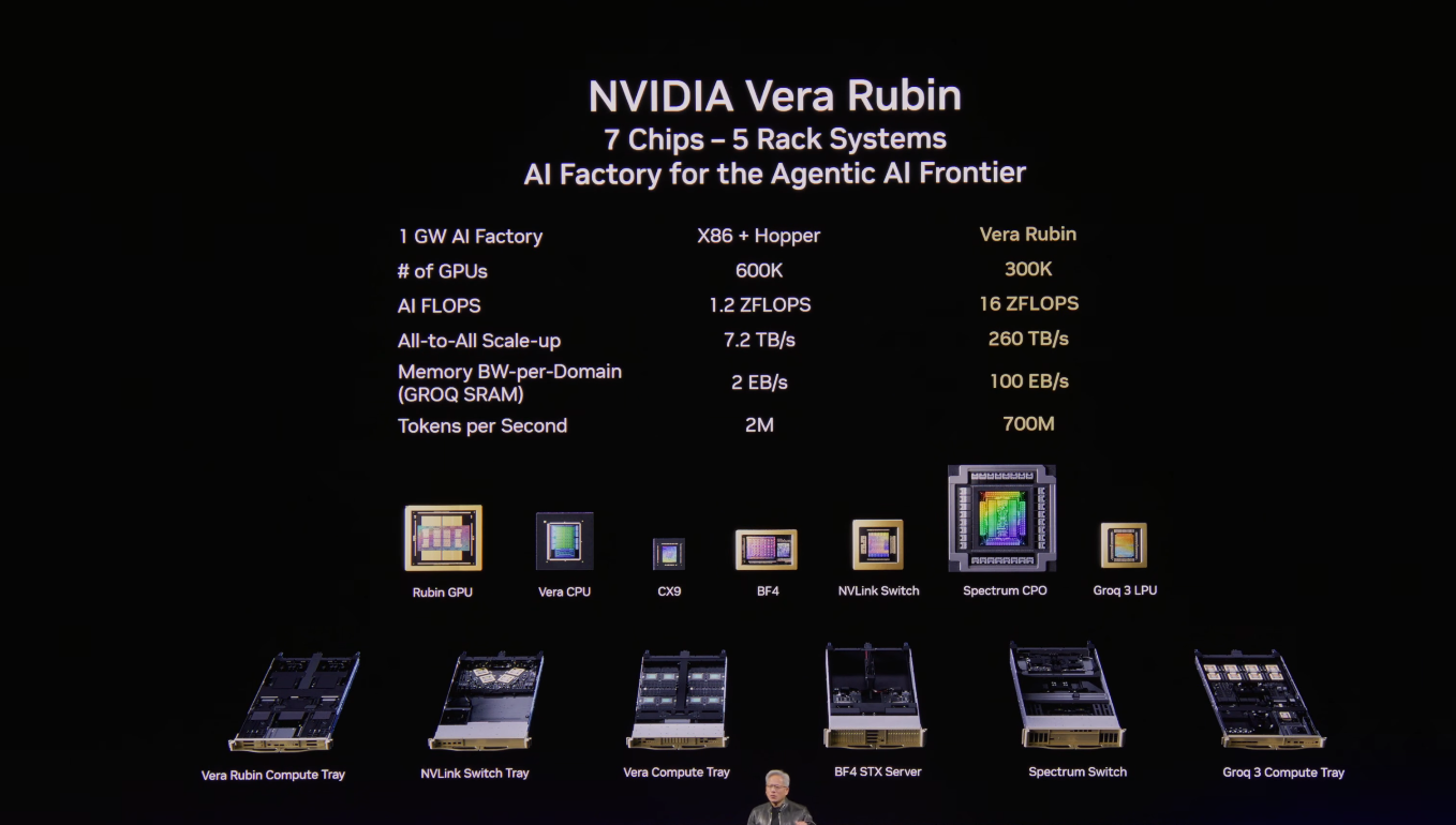 这7款芯片要搭配5种机架——Vera Rubin NVL72 机架、Vera CPU 机架、Groq 3 LPX 机架、BlueField-4 STX 存储机架、Spectrum-6 SPX 以太网机架,最终才能形成完整体。