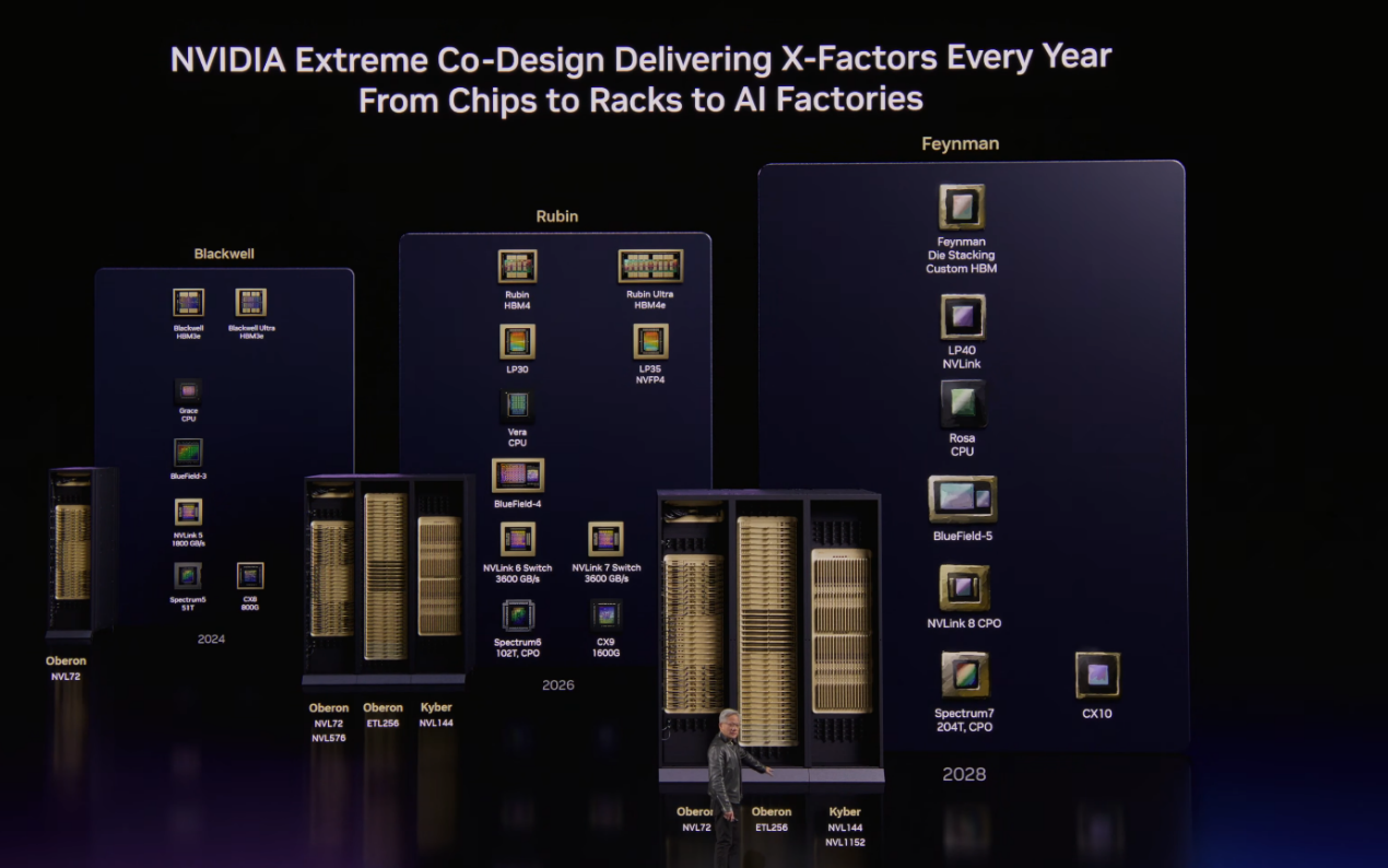 再往后就是下一代的GPU架构费曼Feynman,首发台积电的A16,也就是1.6nm级的工艺,还有3D堆栈封装,定制的HBM内存,搭配的是新一代的LP40 LPU芯片,还有NVLink 8.0、CX10等全新一代芯片,预计2028年问世。