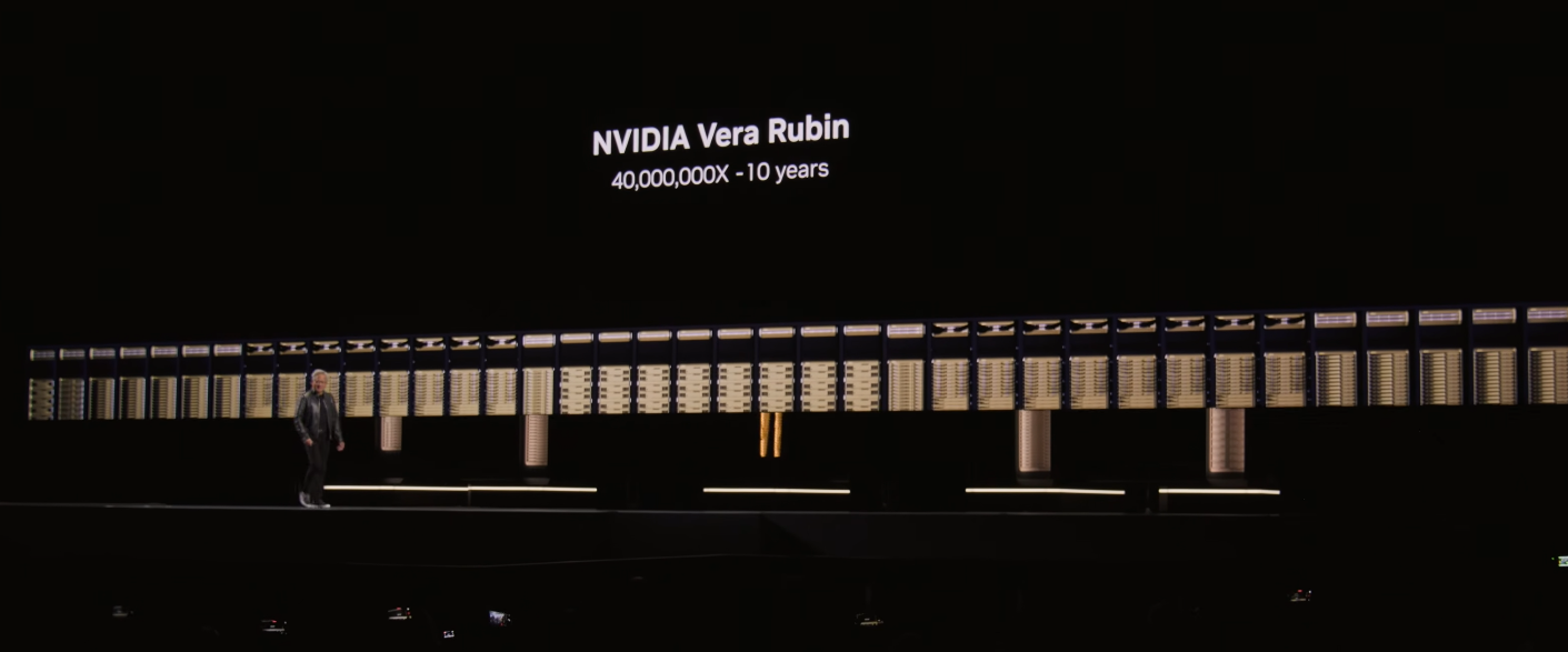 这个性能到底有多夸张,黄仁勋在现场提出了一个对比——相比10年前的计算系统,Vera Rubin的性能提升了4000万倍——仔细对着后面的一堆零数了几次才确定没看错,不过这个数据是对比的10年前什么系统就不得而知了。