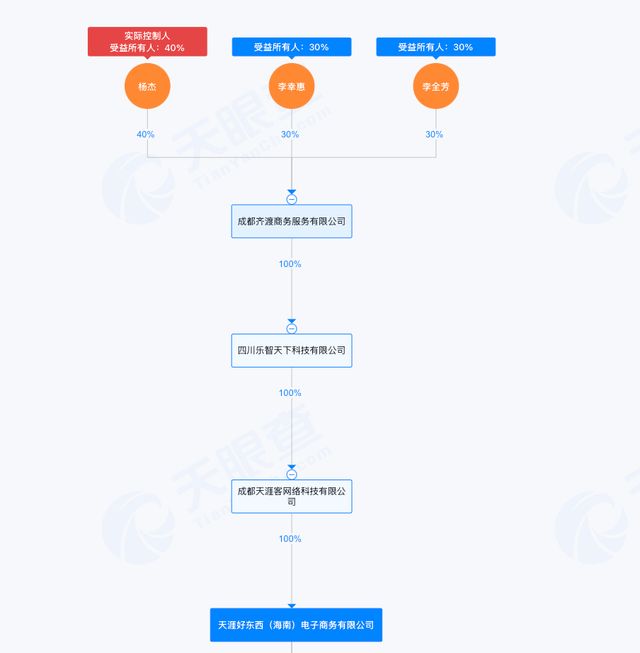 据天眼查显示,成都天涯客成立于2024年4月29日,由四川乐智天下科技有限公司持股99%,林晓凤持股1%。穿透后,四川乐智天下由成都齐渡商务服务有限公司全资持有,成都齐渡商务由杨杰、李幸惠、李全芳分别持股40%、30%、30%。成都天涯客的实控人为杨杰。