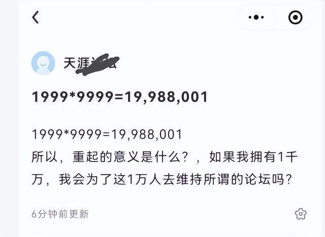 但也有一些网友正在观望,甚至有一些网友表示质疑:“不会是骗子打着天涯的幌子弄的吧?”“重启的意义是什么?如果我拥有1千万,我会为这1万人去维持所谓的论坛吗?”......