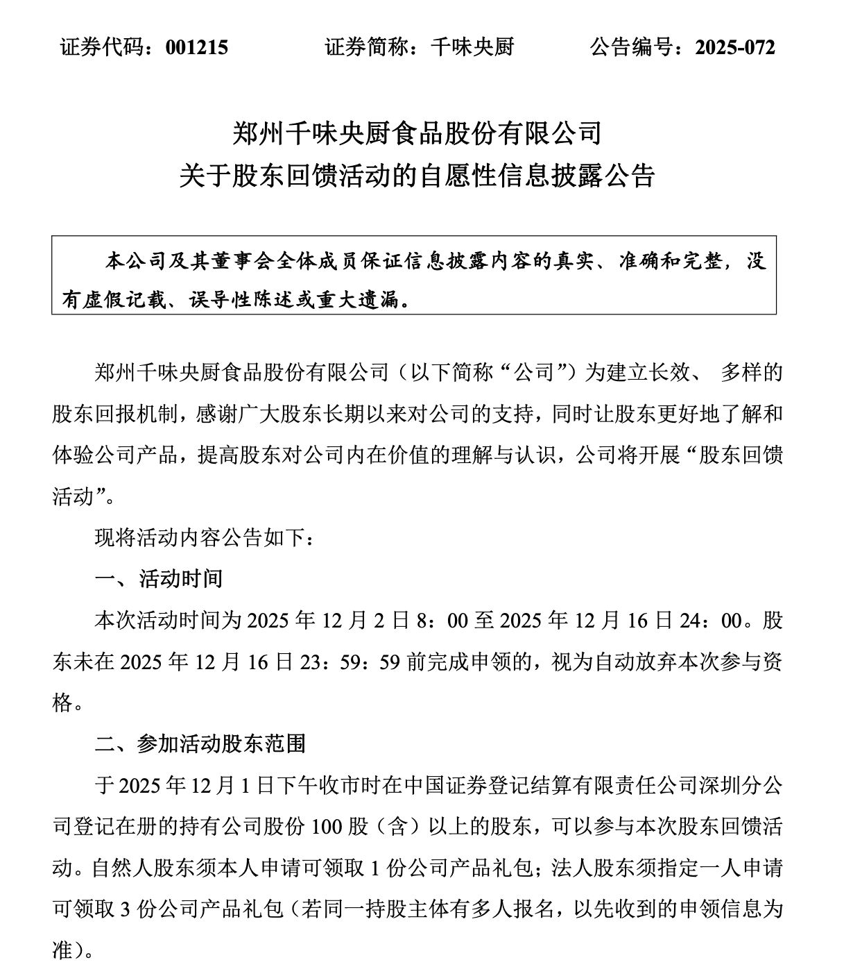 12月1日,千味央厨(001215.SZ)公告称,公司将在2025年12月2日8:00至2025年12月16日24:00期间开展股东回馈活动。活动面向在2025年12月1日下午收市时持有公司股份100股(含)以上的股东,自然人股东可领取1份价值200元的产品礼包,法人股东可领取3份。
