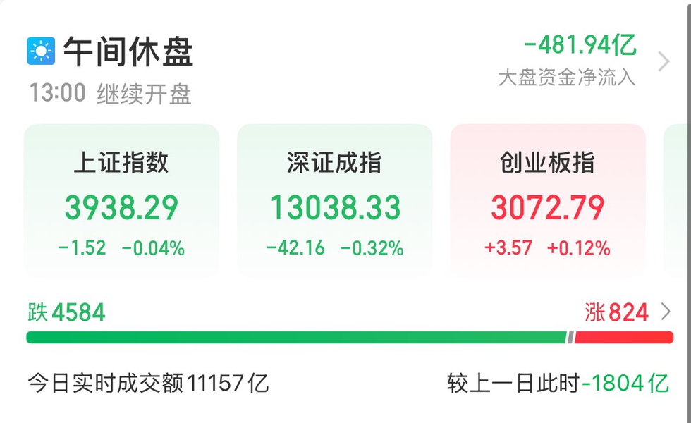 A股三大指数涨跌不一,截至午盘,沪指跌0.04%,深成指跌0.32%,创业板指涨0.12%,北证50指数跌1.52%,沪深京三市半日成交额11157亿元,较上日缩量1804亿元。全市场超4500只个股下跌。