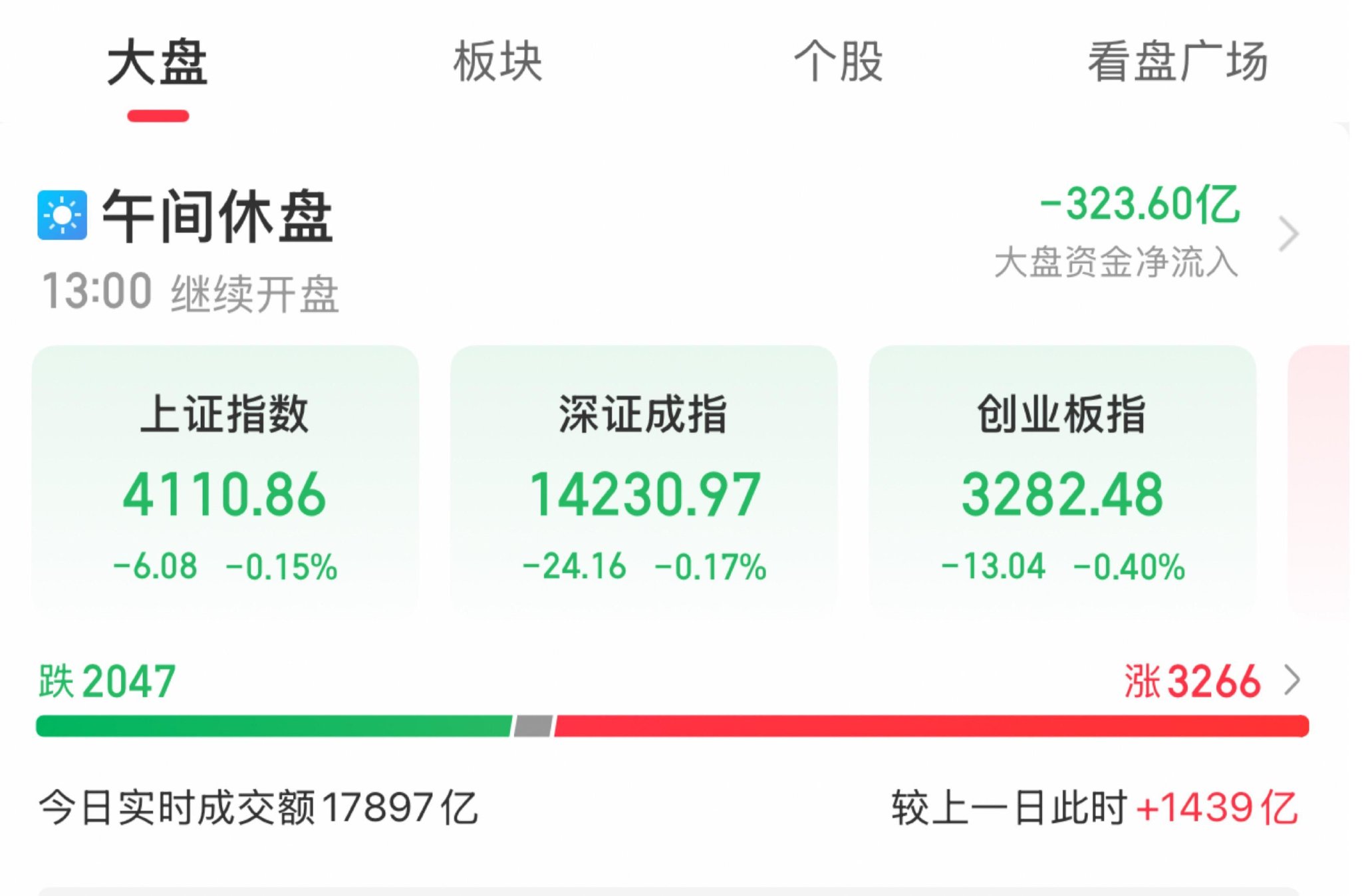 A股三大指数早盘集体调整,截至午盘,沪指跌0.15%,深成指跌0.17%,创业板指跌0.4%,北证50指数涨0.43%,沪深京三市半日成交额17897亿元,较上日放量1439亿元。全市场超3200只个股上涨。