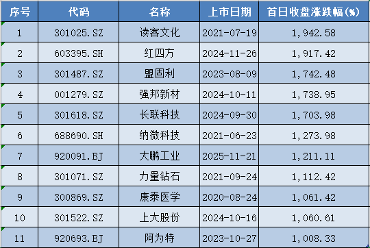 其中,2021年在深交所上市的读客文化(301025),以1942.58%的首日收盘涨幅排名第一。2024年在上交所上市的红四方(603395),涨幅同样超过1900%,以1917.42%的首日收盘涨幅排名第二。