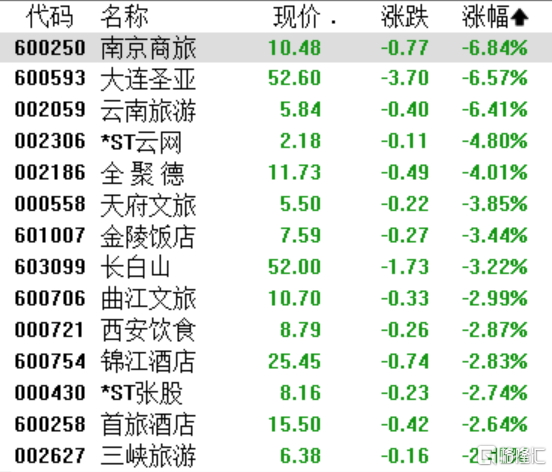旅游股集体下跌,南京商旅、云南旅游、大连圣亚跌超6%,天府文旅、长白山跌超3%,曲江文旅(维权)、西安饮食、锦江酒店、三峡旅游跟跌。