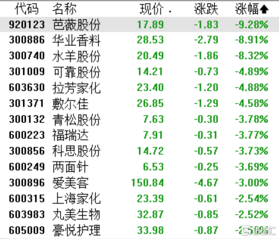 美容护理板块跌幅靠前,芭薇股份跌超9%,华业香料、水羊股份跌超8%,拉芳家化、敷尔佳跌超4%,青松股份、两面针、爱美客、上海家化、丸美生物、豪悦护理纷纷下跌。