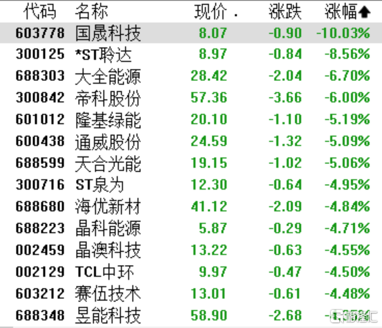 光伏设备板块震荡下行,国晟科技(维权)跌停,大全能源、帝科股份跌超6%,隆基绿能、通威股份、天合光能跌超5%。