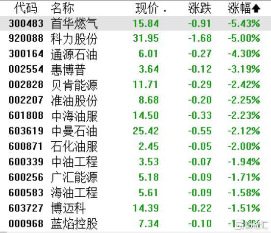 油气开采板块表现较弱,首华燃气跌超5%,通源石油跌超4%,贝肯能源、准油股份、中海油服、中曼石油跌超2%。