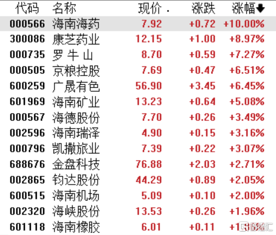 海南板块震荡走高,海南海药涨停封板,康芝药业涨近9%,海南矿业涨超5%,海德股份、海南瑞泽、凯撒旅业(维权)涨超3%。