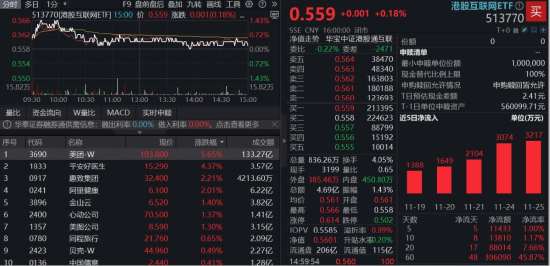 港股AI三连涨,重仓互联网龙头的港股互联网ETF(513770)场内价格一度涨逾1%,收盘微涨0.18%,连涨3日。