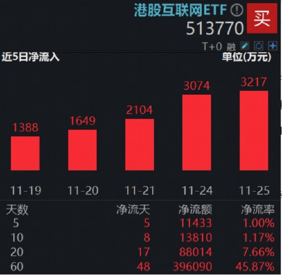 已有资金借道ETF抢跑布局港股AI核心资产,上交所数据显示,港股互联网ETF(513770)近5日连续吸金合计1.14亿元。