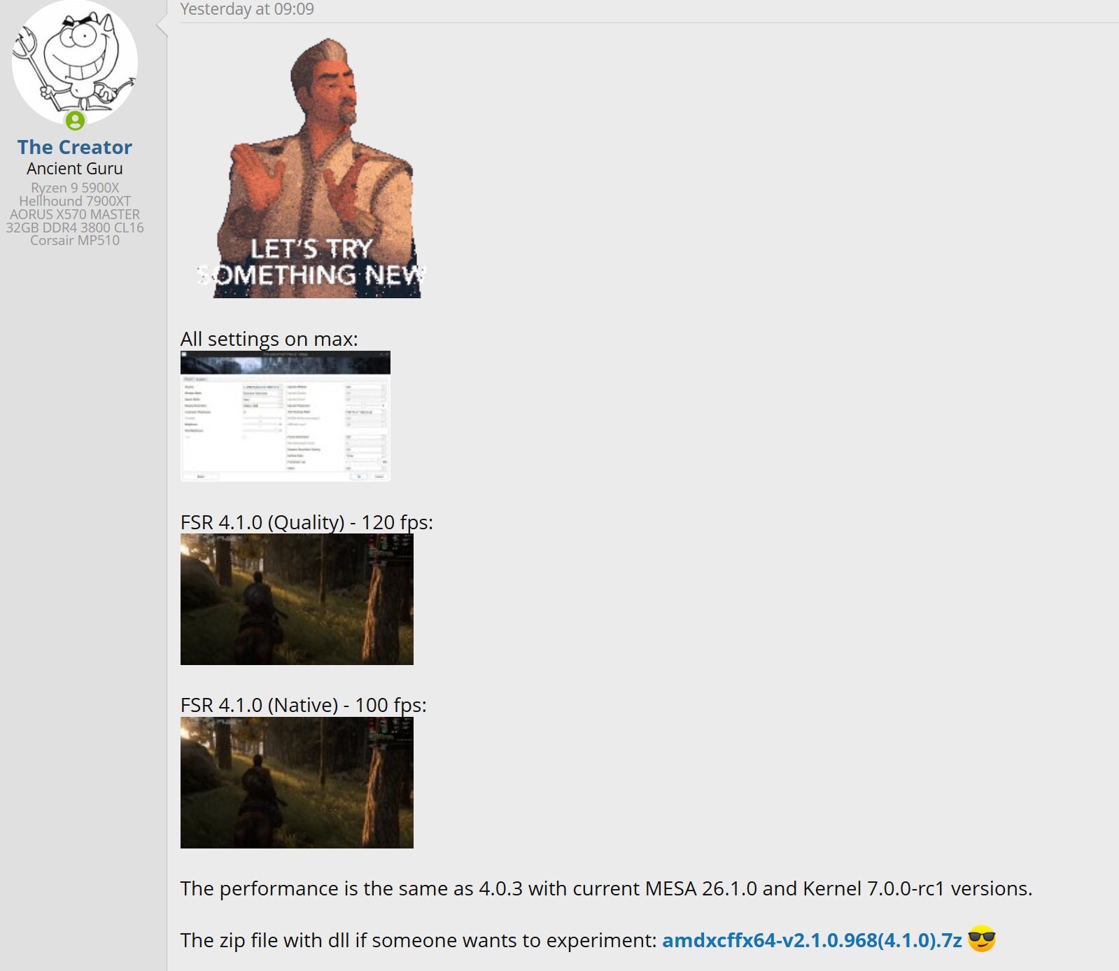 有趣的是,有网友在RX 7900 XTX上测试了FSR 4.1,而根据官方需求,这款上代旗舰并不支持FSR 4。
