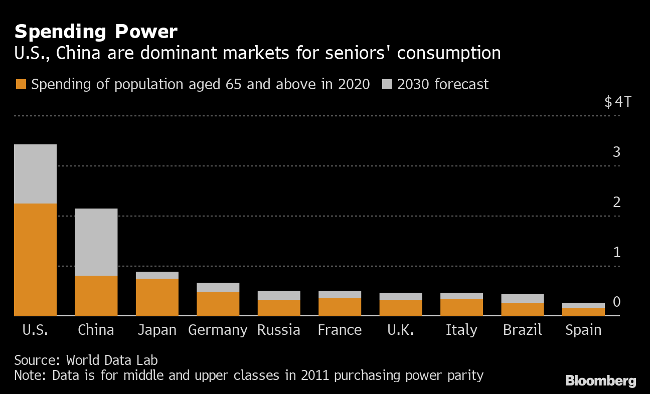 The number of people aged 65 and over is projected to double to more 1.5 billion by 2050, greatly increasing their economic impact. The total spending power of the older population globally was about $8.4 trillion in 2020, according to World Data Lab. That’s expected to grow to $14 trillion over the next decade.