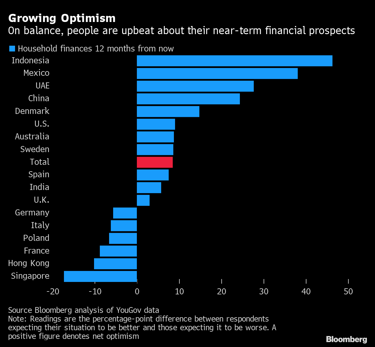 The findings revealed growing optimism, with households in most countries expecting to be better off 12 months from now than they are currently. Most complained of a painful hit to their finances since the pandemic, led by India.
