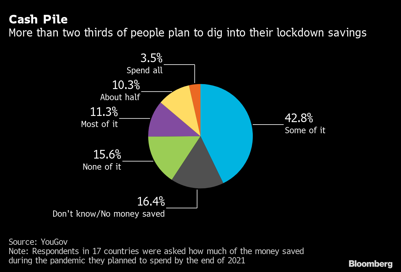 The findings by the pollster YouGov Plc shed light on one of the biggest questions economists are attempting to unravel. How quickly households spend their spare cash -- estimated at 250 billion pounds ($347 billion) in the U.K. and 500 billion euros ($596 billion) in the euro area -- will determine the strength of the recovery from the pandemic recession.
