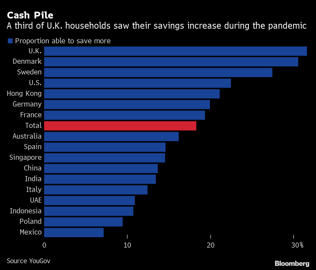 About a third of people in the U.K. increased savings since March 2020, similar to the level in Denmark but much higher than in the U.S., Germany, Italy, Spain and Australia, YouGov said. Its results were made available to Bloomberg.