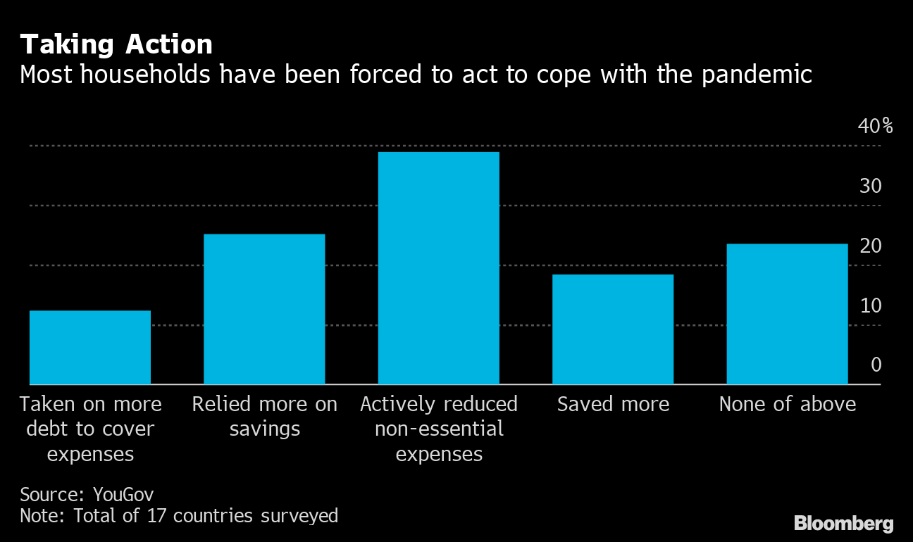 Across the countries in the poll, most people took on debt, tapped savings or cut into non-essential spending. Less than a fifth were able to save more, YouGov said. That adds to evidence that it’s the richest households that were able to put away money, while most people suffered.