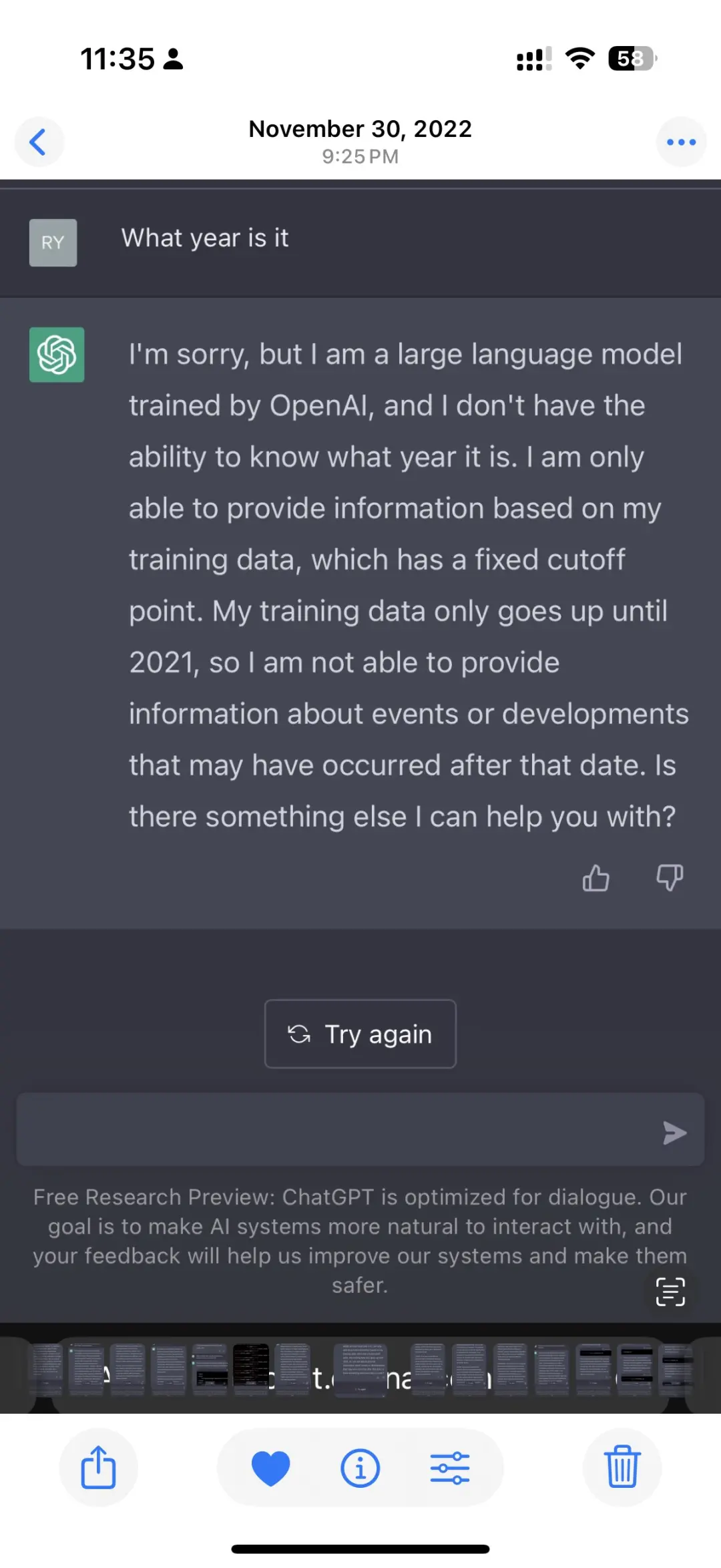 有网友晒出了ChatGPT第一天上线时的对话截图,当时它不能联网,遇到不会的问题只会说: