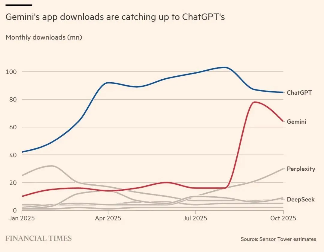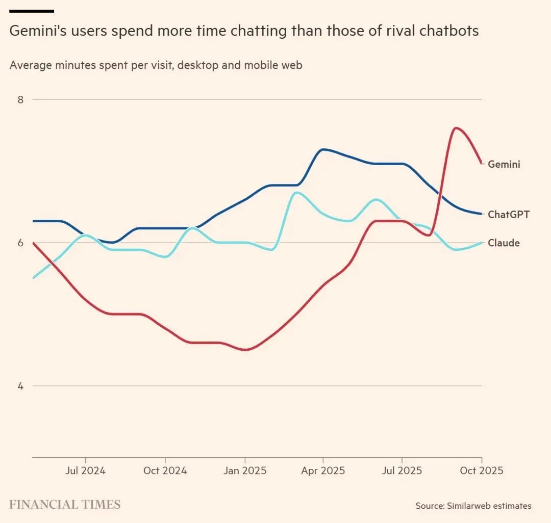 虽然拥有超过8亿周用户的OpenAI,在使用量上仍占据绝对主导的市场份额,但用户现在花在与Gemini聊天上的时间已经超过了ChatGPT。