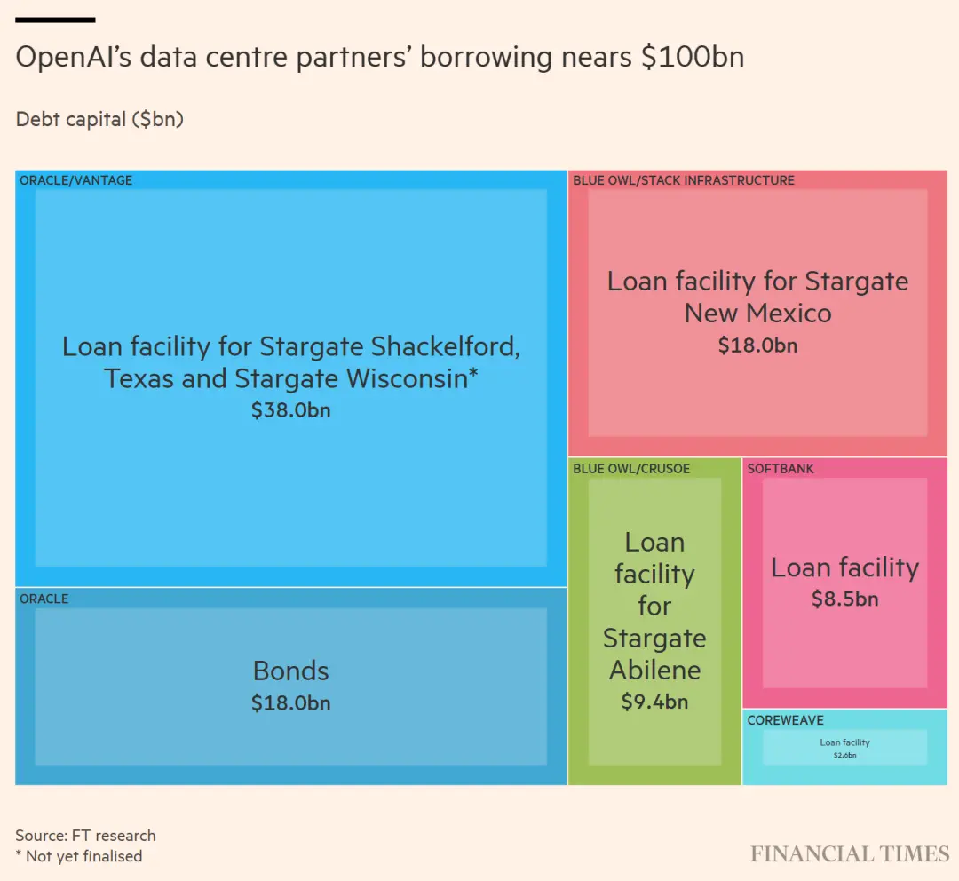 根据《金融时报》的分析,软银、甲骨文和CoreWeave为了投资OpenAI或者帮它建数据中心,至少已经借了300亿美元。