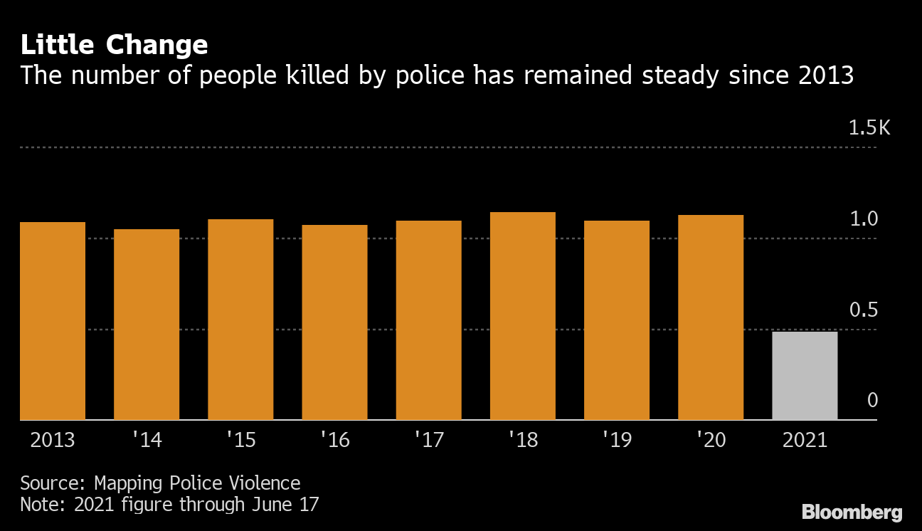Over 1,000 people have been killed by on-duty cops each year since 2013, an annual rate that has held steady, according to Mapping Police Violence, which tracks nationwide police killings.