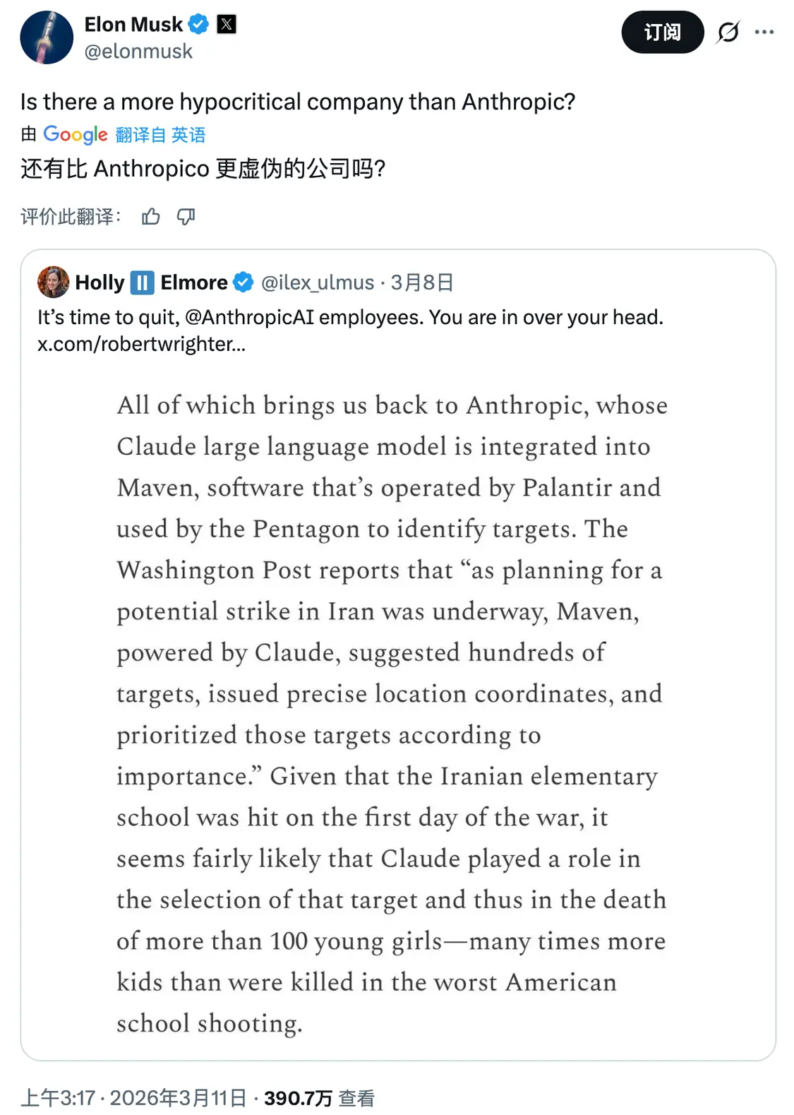 PauseAI US执行董事霍莉·埃尔莫尔(Holly Elmore)此前在X上发帖,呼吁Anthropic员工辞职,称他们已经陷入了难以掌控的局面。埃尔莫尔称,Anthropic的AI工具Claude协助美国挑选了对伊朗首轮空袭的数百个目标,其中很可能就有那所导致100多名女童死亡的小学。