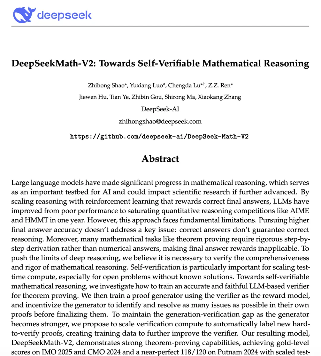 在这篇名为《DeepSeek Math-V2:迈向可自验证的数学推理》的论文中,DeepSeek指出,大语言模型已经在数学推理方面取得了重大进展,这是人工智能的重要试验台,如果进一步推进,可能会对科学研究产生影响。
