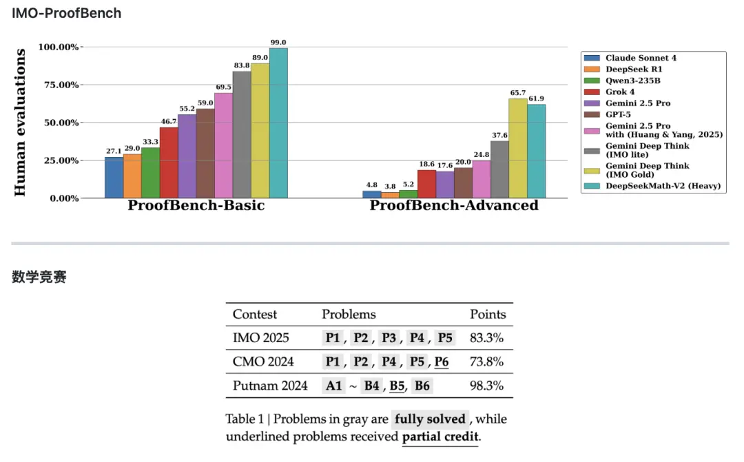 在同步发布的技术论文中,DeepSeek表示,Math-V2的部分性能优于Google旗下的Gemini DeepThink,并展示了模型在IMO-ProofBench基准以及近期数学竞赛上的表现。