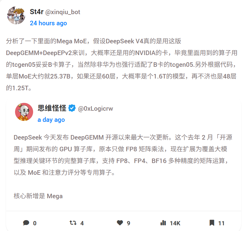 万一1.6T没实现,1.25T参数量也会比当前V3的6700亿参数量翻倍,依然可以期待下表现,毕竟Mega MoE技术再做到数千个激活专家,那绝对是一次蜕变,改变MoE架构大模型发展的里程碑事件。